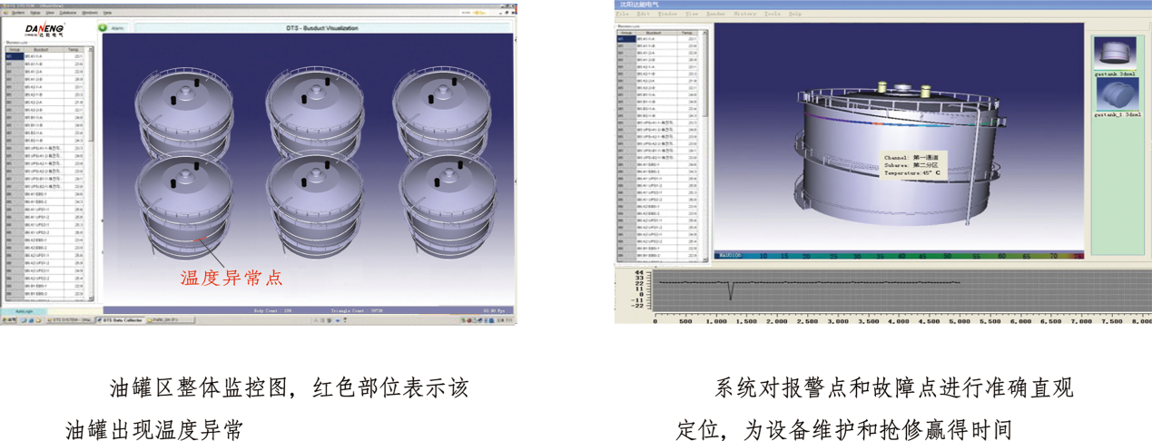 油罐/气罐内储存的各种油品气品一般都具有易挥发、易燃烧、易爆炸等性质,一旦发生火灾,必将造成重大的损失。以DT400系列“分布式光纤感温火灾探测器”为主要部件的油库火灾探测系统可连续测得油罐周身的分布温度,完全无电检测,本安防爆。将感温光纤安装到浮顶油罐内壁接合部位或是油罐外表面,一旦油罐温度超过设定值,光纤系统会立刻发出报警信号。